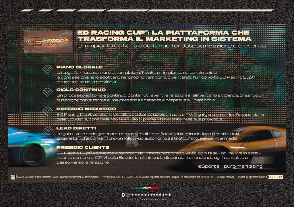 ED Racing Cup® abilita un piano globale: la Lega fornisce contenuti, template ufficiali e un impianto editoriale unico; la concessionaria lo adotta nel proprio territorio e diventa il volto riconoscibile di ED Racing Cup® nella propria provincia. Questo tende a ridurre un rischio concreto per il dealer: dispersioni operative e discontinuità dovute a tempi, risorse o mancanza di regia interna.