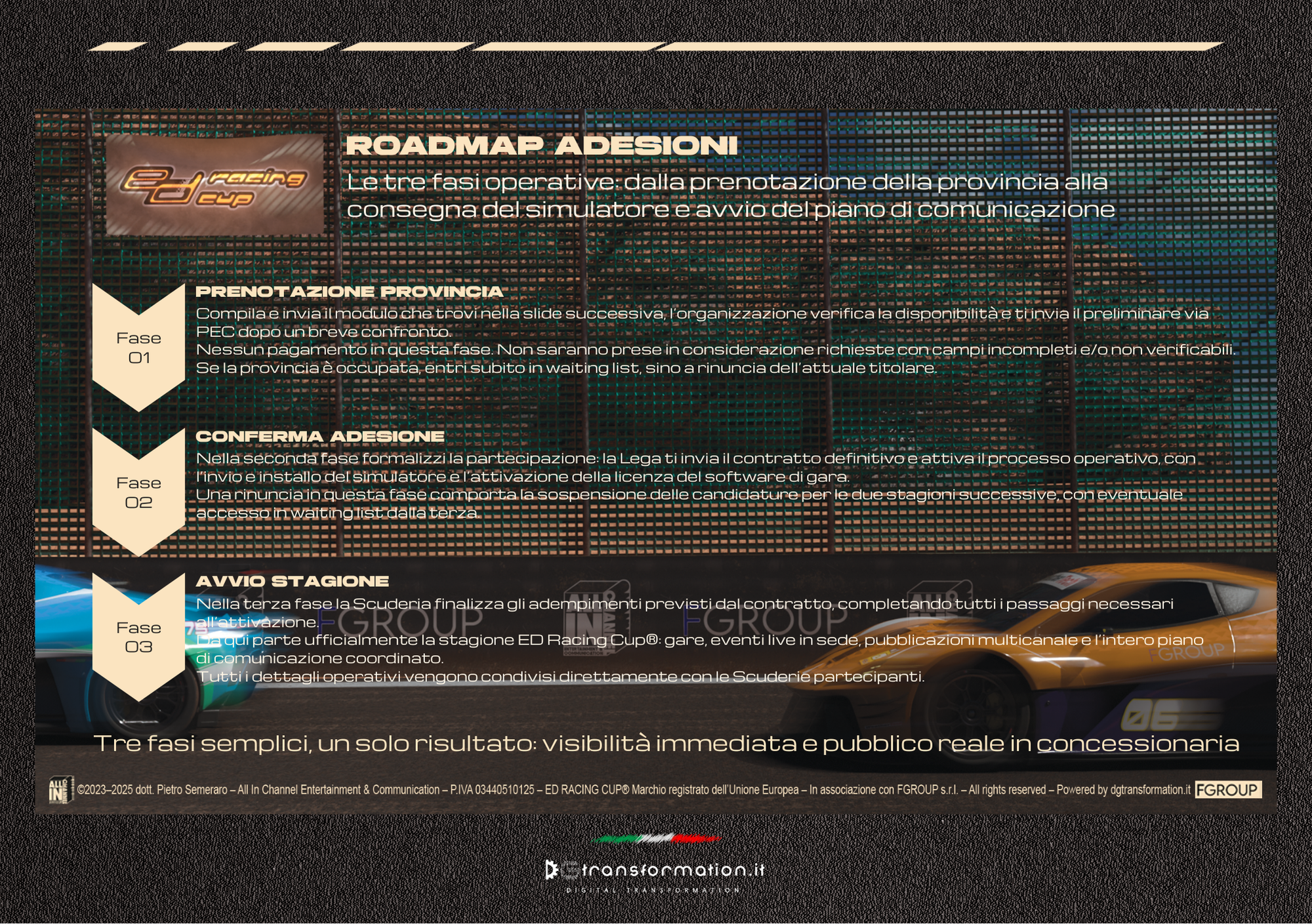 Il processo di adesione è semplice e immediato: tre fasi che portano la tua Scuderia dalla candidatura all’avvio operativo del sistema ED Racing Cup®.